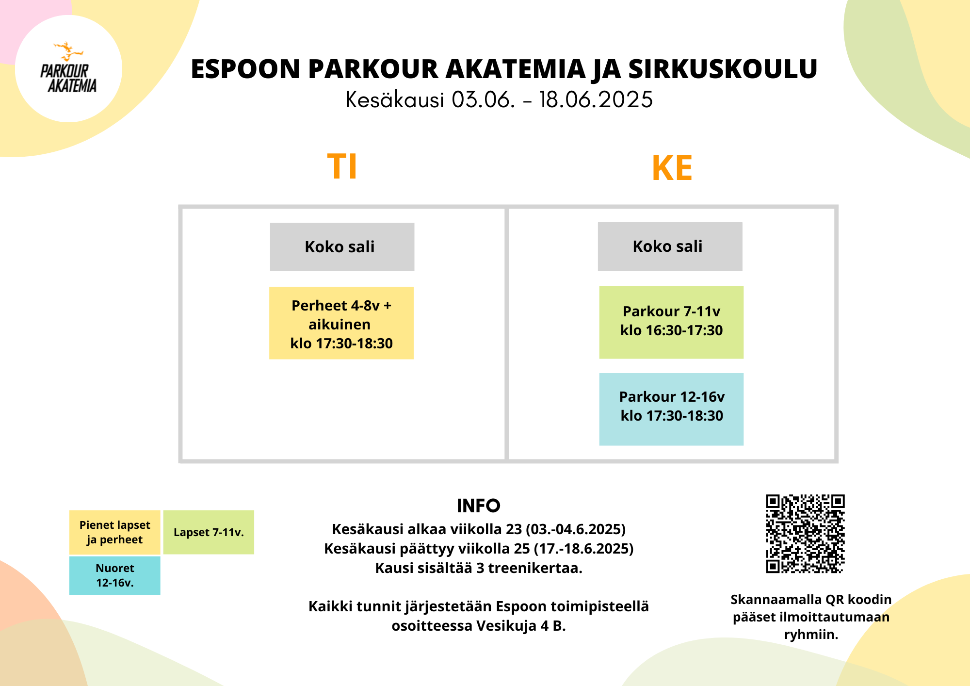 Espoon Parkour Akatemian ja Sirkuskoulun kevätkausi starttaa viikolla 4 (19.-25.1.) ja kausi loppuu viikolla 20 (11.-17.5.). Kausi sisältää 16 harjoituskertaa.