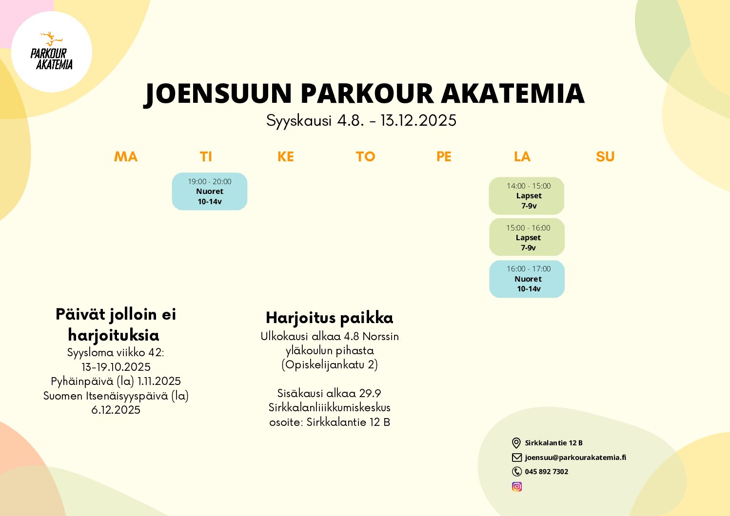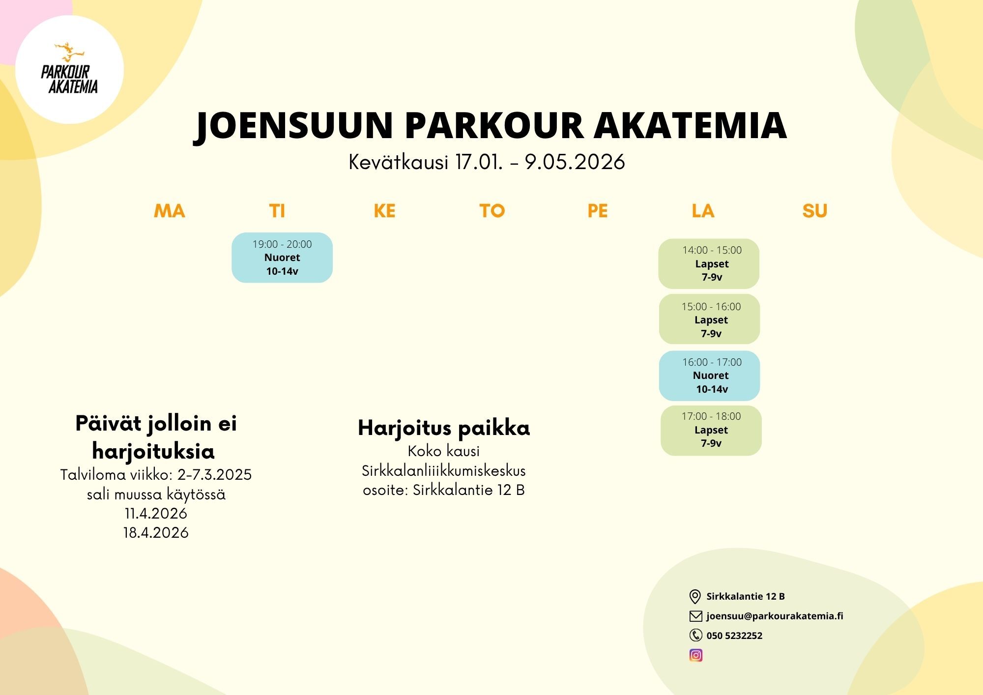 Mikäli kysyttävää herää, parhaiten tavoitat meidät sähköpostitse joensuu@parkourakatemia.fi / 050 5232252 (arkisin klo 11-15)