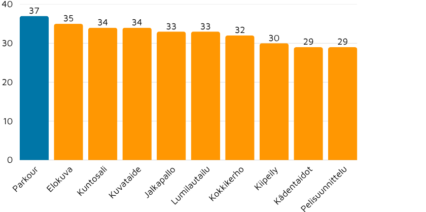 Koululaisten harrastustoiveet lajeittain vuonna 2024. Lähde: OKM koululaiskysely 2024.