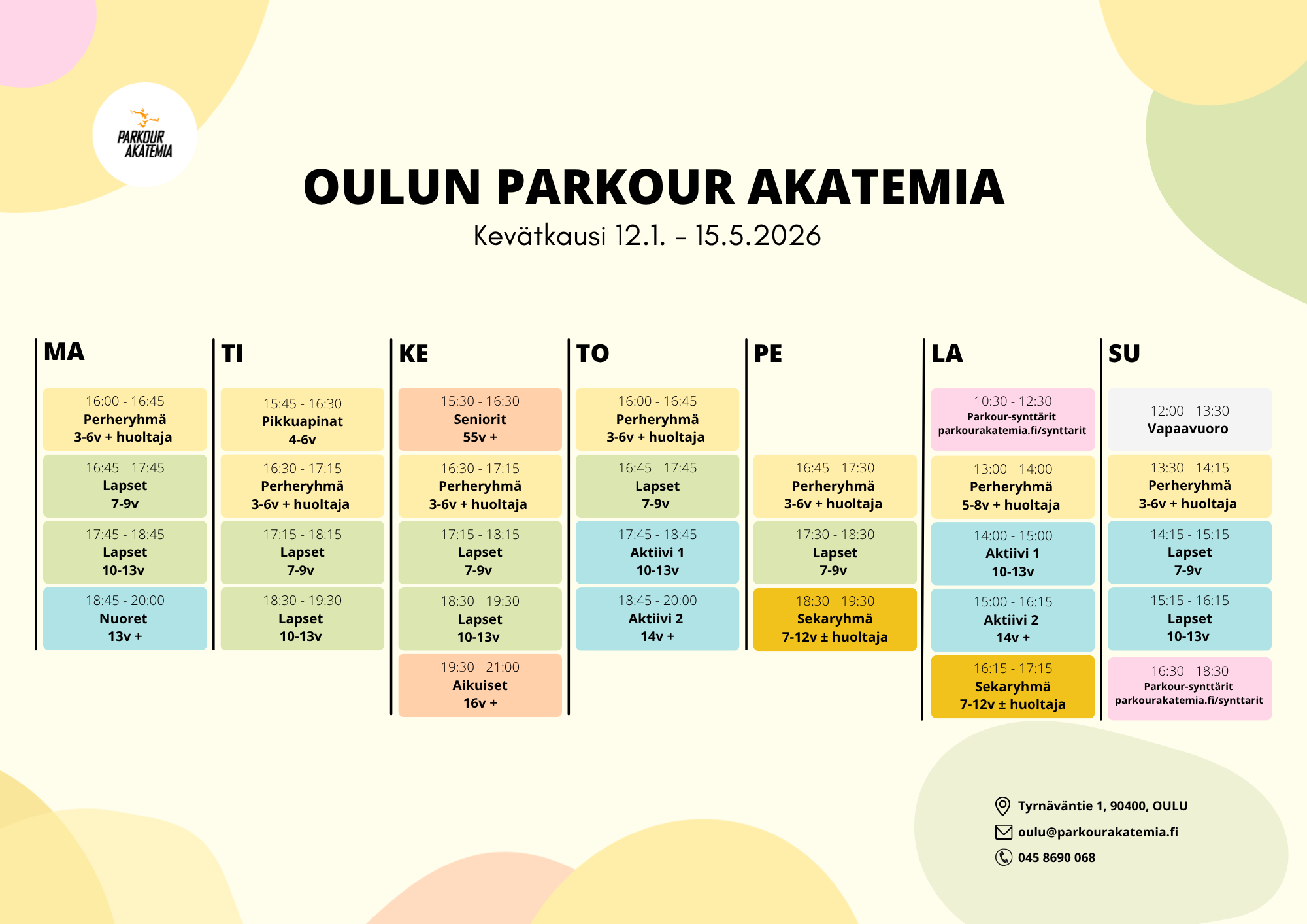 Parkour Akatemia toteuttaa Oulussa liikuntakasvatusta parkourin keinoin. Tavoitteena on innostaa niin lapsia kuin aikuisiakin liikkumaan monipuolisesti sekä kokemaan liikunnan iloa.