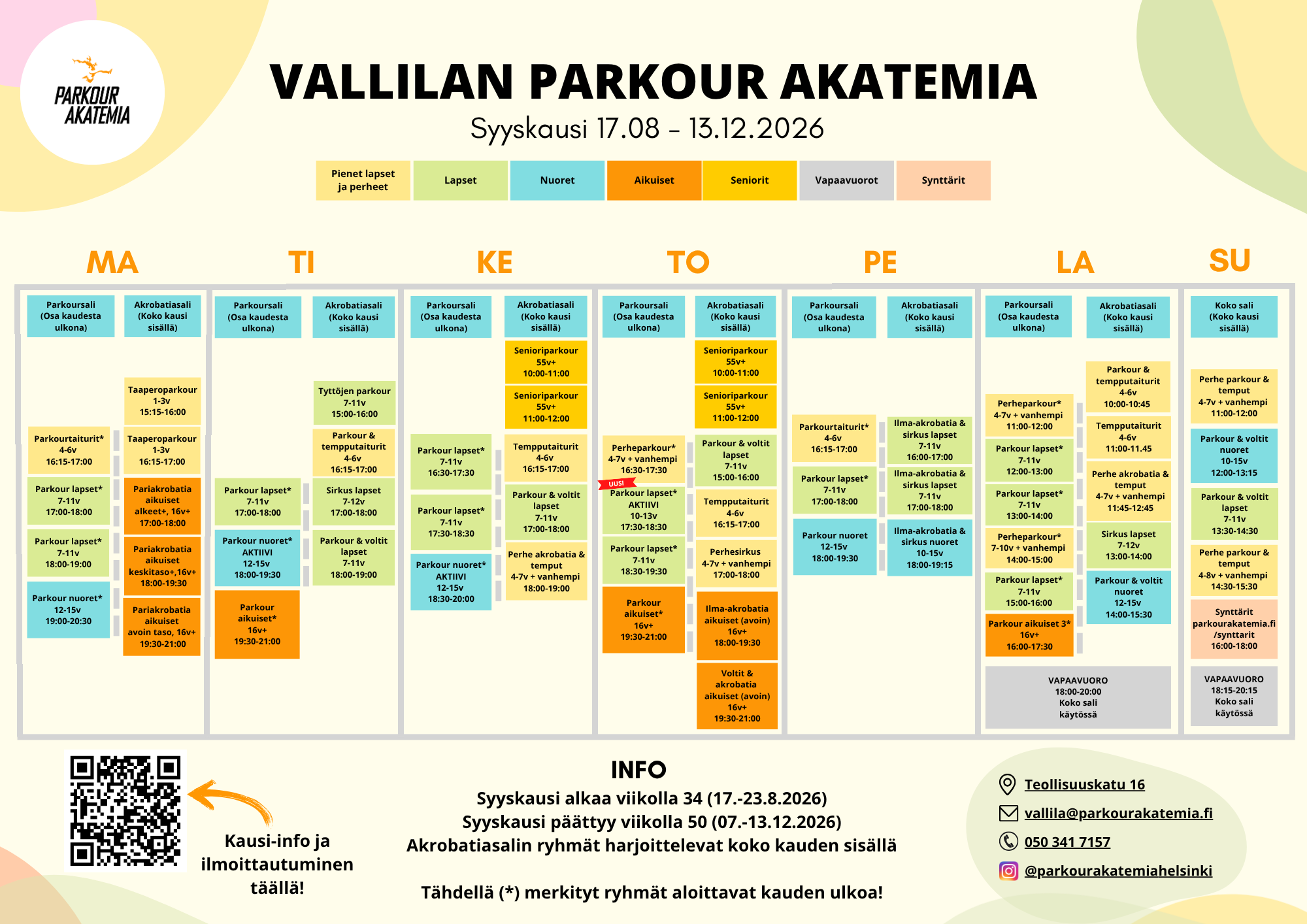 Lisätietoja sähköpostilla vallila@parkourakatemia.fi tai toimistolta 050 341 7157 (ma-ke klo 11-15).