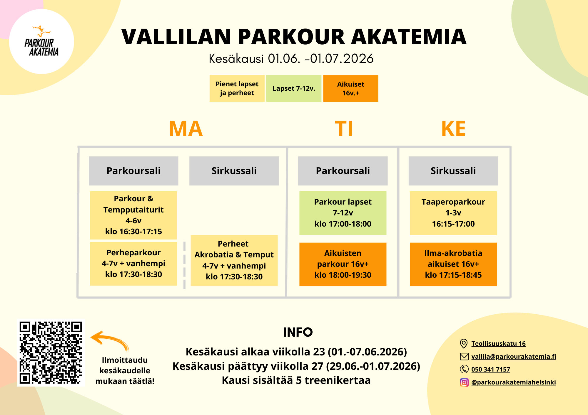 Kausi on jaettu puoliksi ja kausimaksun voi suorittaa kahdessa osassa. Meille voit ilmoittautua myös kesken kauden, jolloin maksat vain jäljellä olevista kerroista! Laita meille sähköpostia vallila@parkourakatemia.fi mikäli sinulla on kysyttävää kausihinnasta!